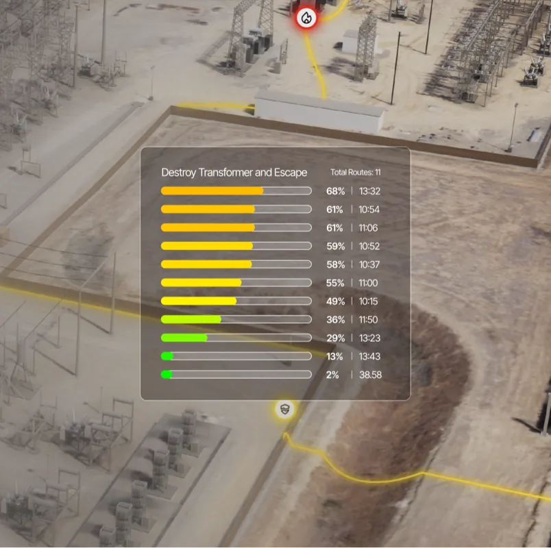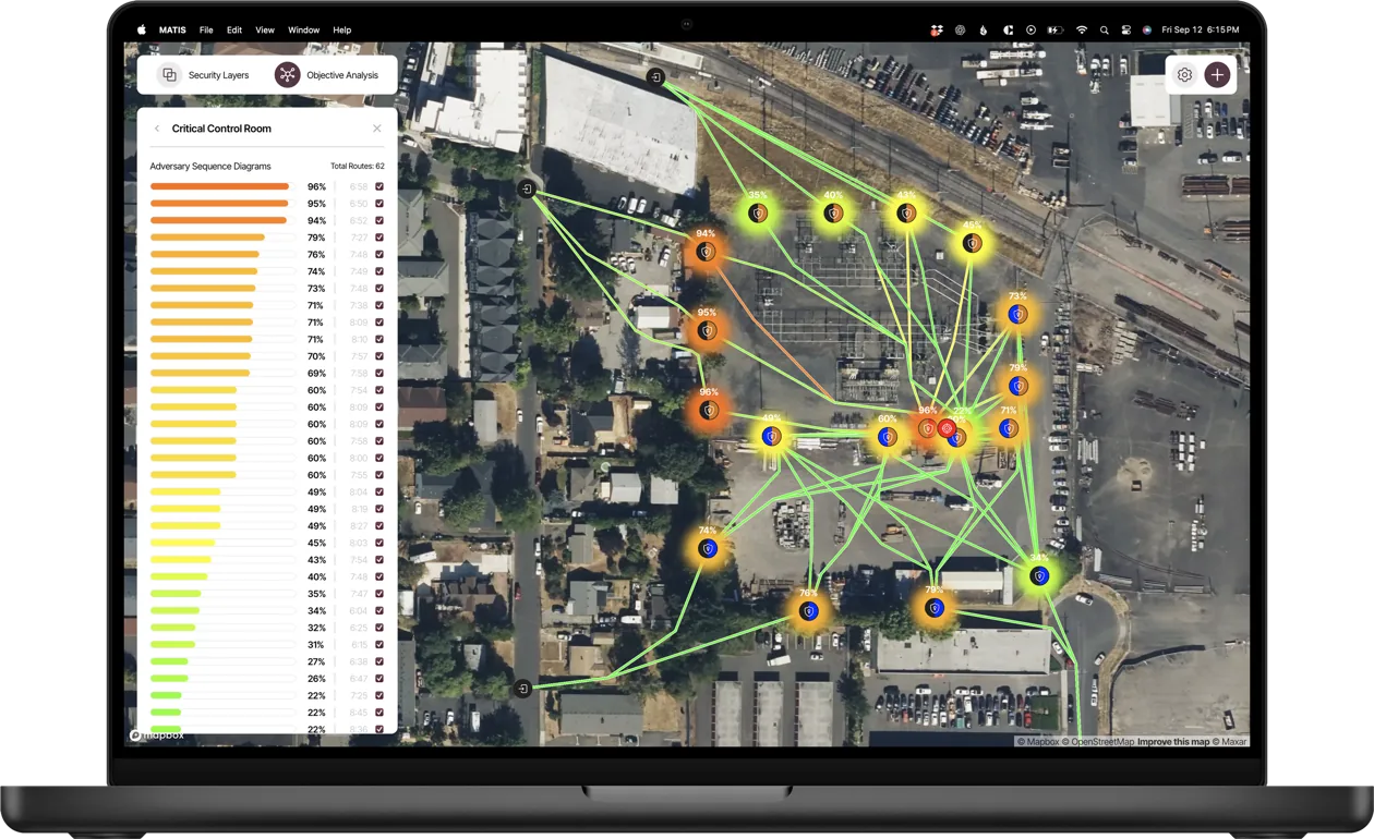 MATIS simulates how a real adversary could move through the site, step by step. Each path is evaluated based on time, exposure, and likelihood of detection to reveal where risk concentrates.
